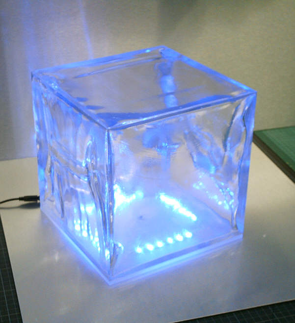 polyacryl, 23x23x23 cm mit 24 Leuchtdioden im 6mm flachen satinertem Acrylboden inkl. Netzteil. Preis: 150, - Netto. |